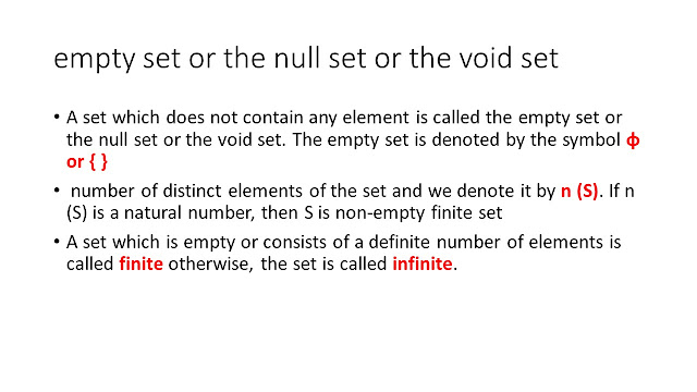 A set which does not contain any element is called the empty set or the null set or the void set. The empty set is denoted by the symbol Ο or { }